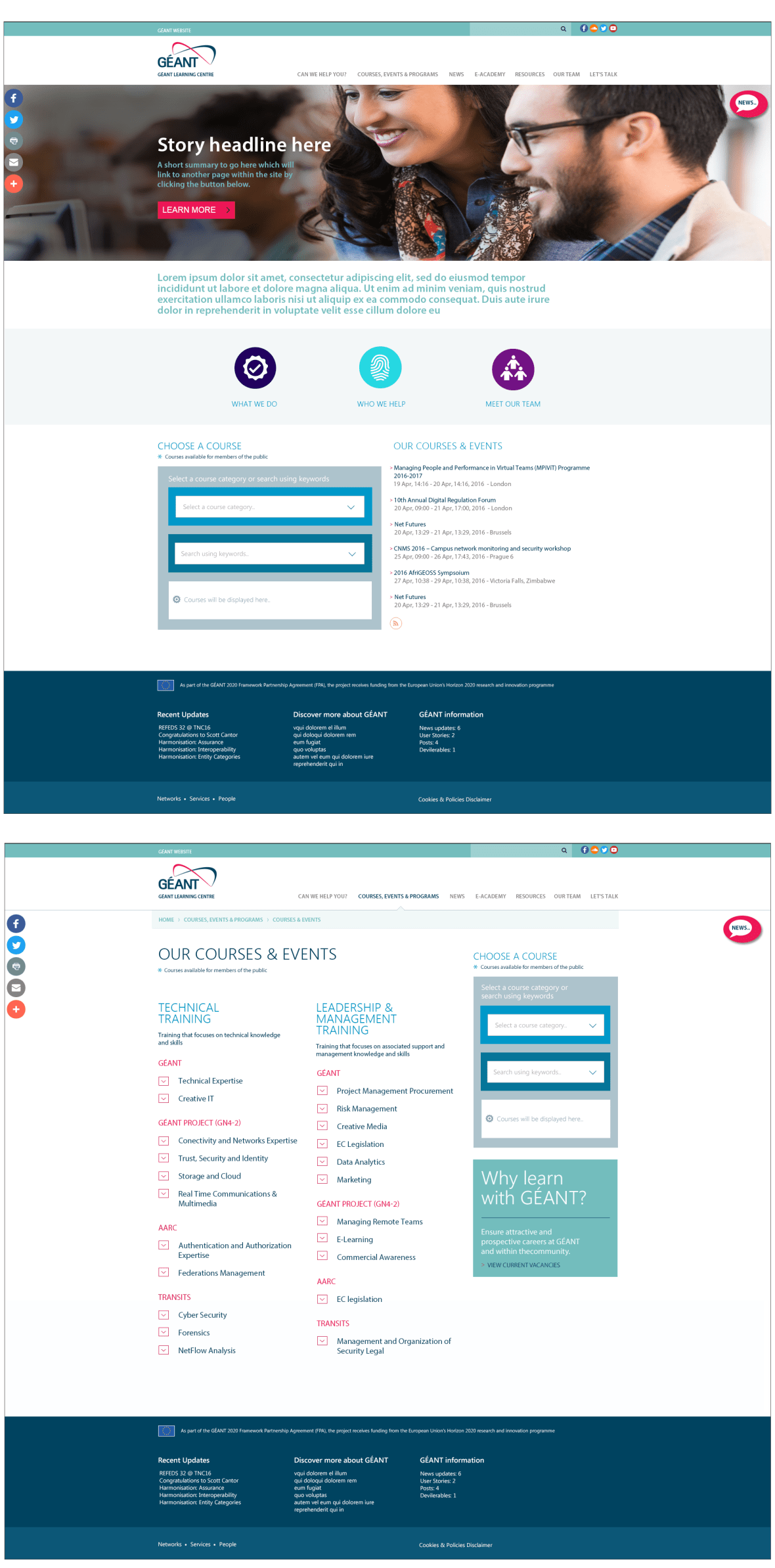 GÉANT Learning and Development is the new training site for the European community of networking professionals. The visuals below show the Home page and a second level page. The site has been designed adhering closely to the GÉANT brand guidelines whilst giving it a fresh and energetic new feel through the choice of language, colours and imagery used.