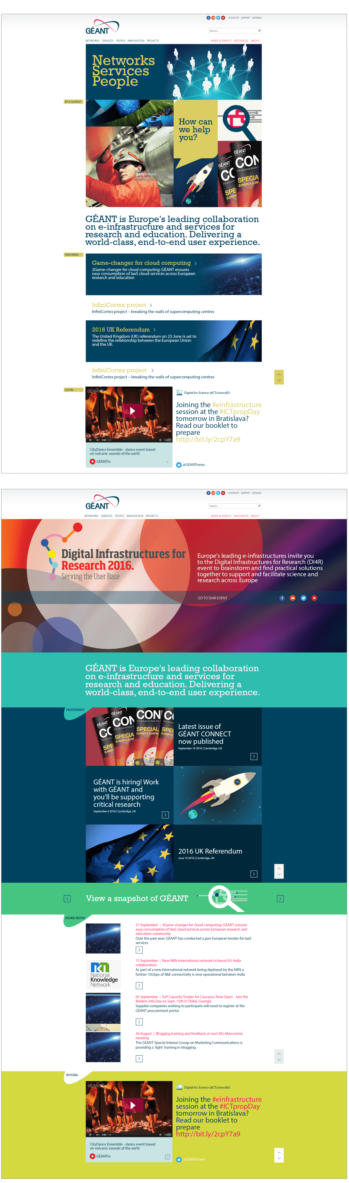 A couple of concepts for a fresh new look for the GÉANT home page that would would enable GÉANT to present a large amount of copy and content in a more visual manner. Making the site easier to navigate, more personable and engaging.