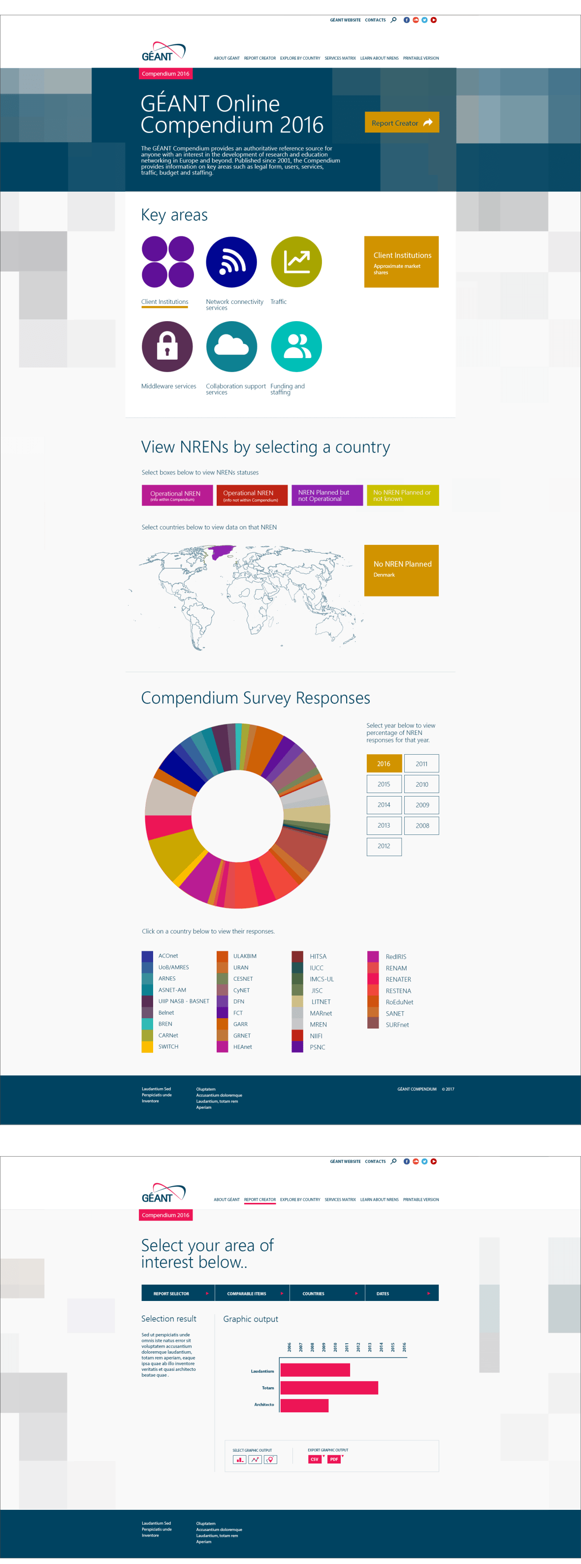 The GÉANT Compendium provides a comprehensive record of research and education networking data. These are concepts for the Home page and a second level page demonstrating Live data being generated using D3 in an eye catching, intelligent manner. The header remains as per the GÉANT brand guidelines but with the addition of over sized pixels as a background.